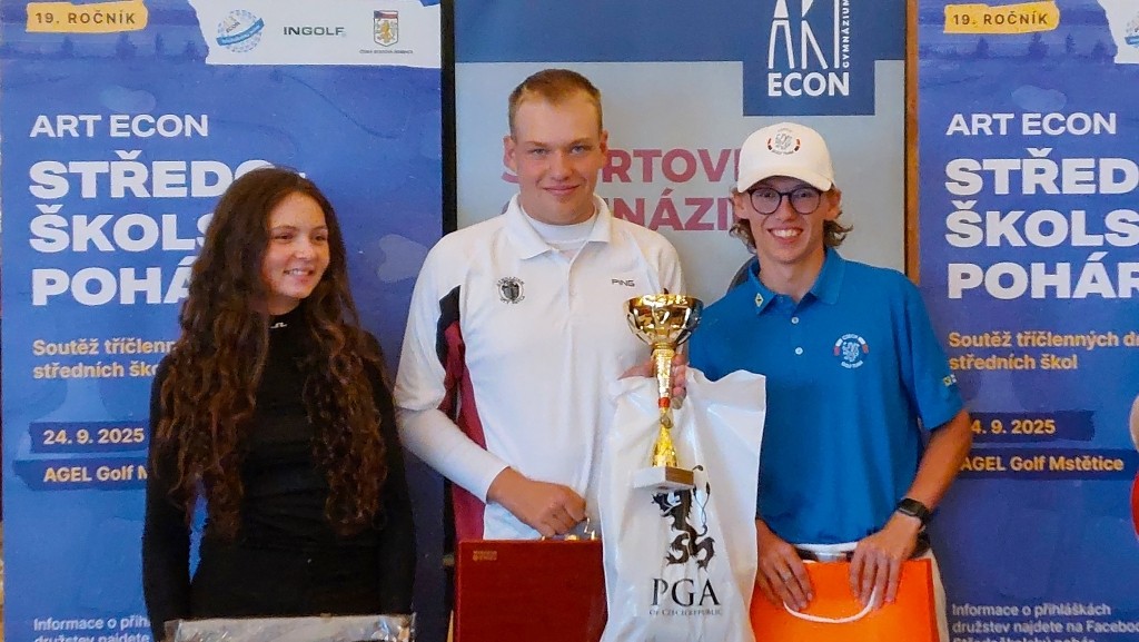 Naši žáci Barbora Kamrádková (7.O), Tereza Kamrádková (6.O) a Mikuláš Vojtěšek (2.B) úspěšně obhájily prvenství na Art Econ středoškolském poháru v golfu. Ten se letos za velmi nepříznivého počasí konal v golfovém centru Agel Golf Mstětice.